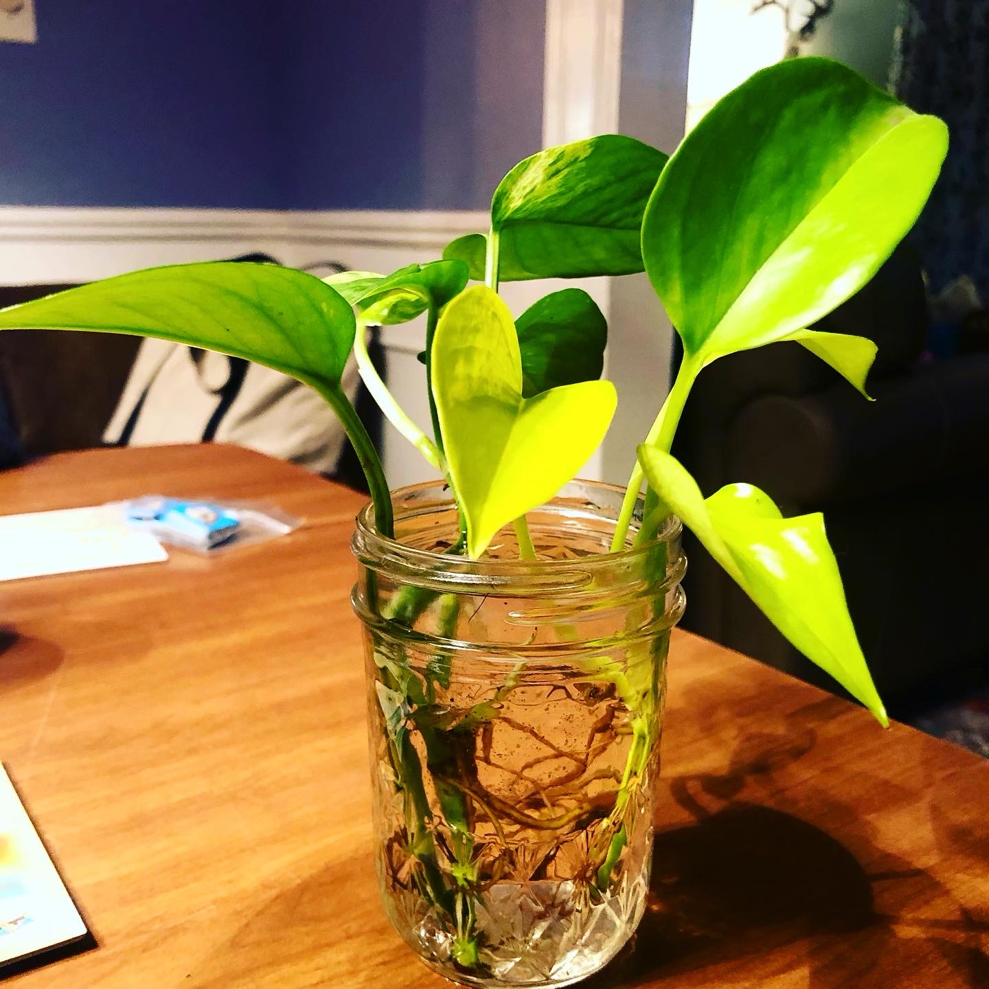 A few months ago, Emily cut off a few pieces from her Neon Pothos and Marble Pothos to share with me. She took the pieces and put them into a jar with water. After just a few weeks, new roots started to grow.